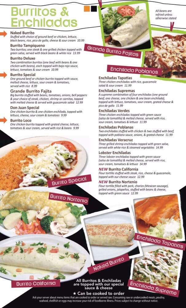 Big burrito stuffed with beans, tomatoes, onions, bell peppers and your choice of steak, chicken, shrimp or carnitas. Topped with melted cheese and served with guacamole salad.