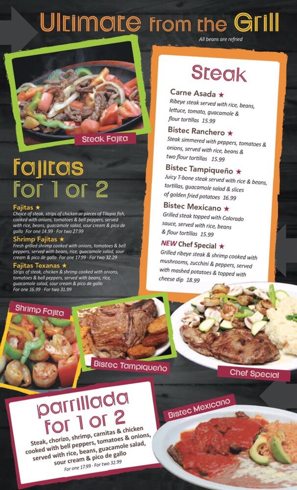 Choice of chicken, tilapia fish or steak cooked with onions, bell peppers and tomatoes, served with fried beans, guacamole salad and pico de gallo and flour tortillas.
